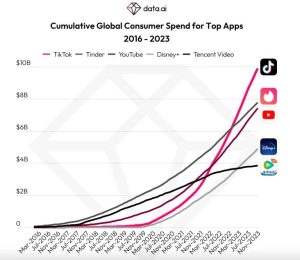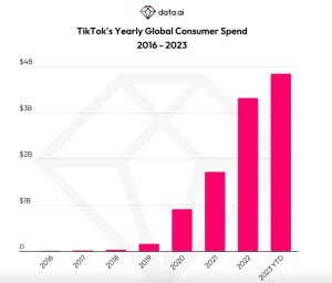 Data.ai’nın raporuna göre, TikTok, bu yılın başında Apple ve Android uygulama mağazalarında toplamda 6,2 milyar dolarlık kullanıcı harcamasına ulaştı. Yılın geri kalanında ise %61’lik büyümeyle 3,8 milyar dolarlık harcamayı aştı, bu da 2022’nin tamamında elde edilen 3,3 milyar dolarlık harcamayı geçti. Üstelik bu raporda farklı mağazalardan yapılan işlemlerin bilgileri de dikkate alınmadı.